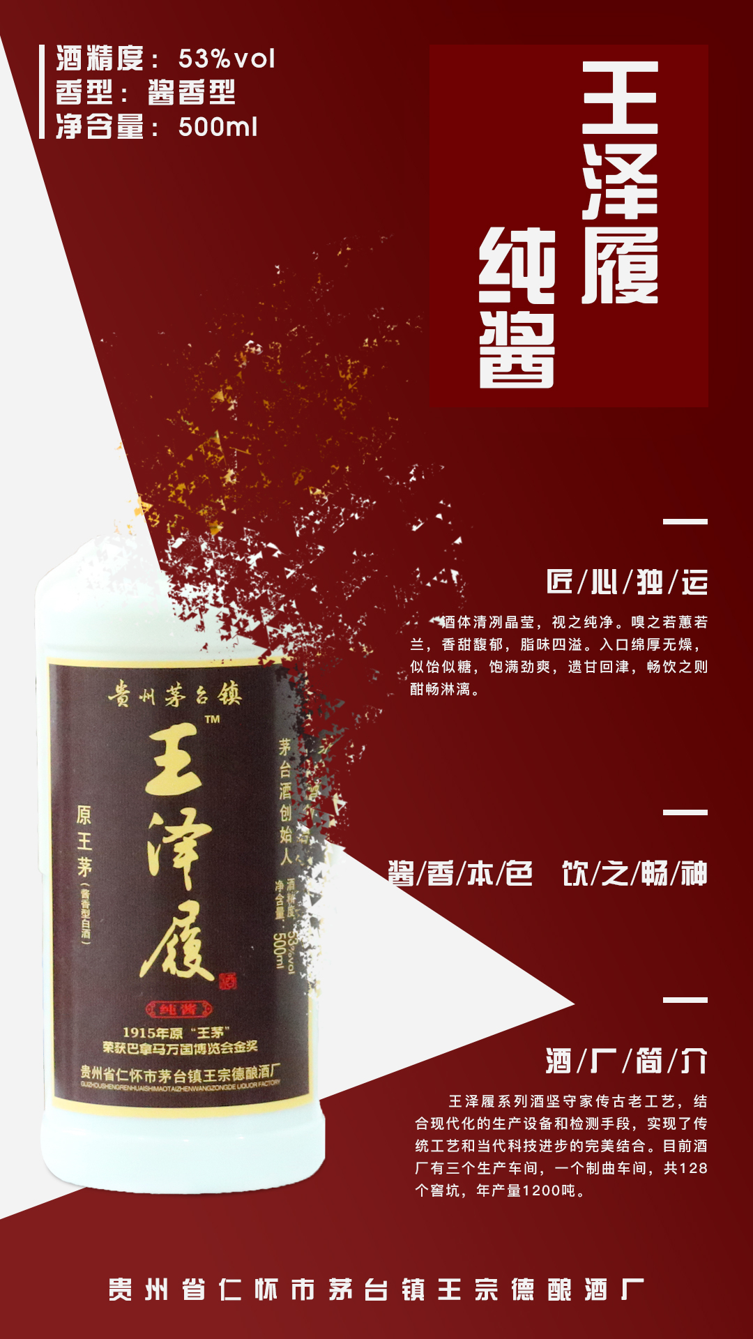 品 名: 王泽履 名酱 原 料: 高粱、小麦、水 香 型: 酱香型 执行标准: GB/T26760-2011(优级) 酒精度: 53%vol 净含量: 500ml/瓶 酒 体: 5年基酒(80%)+10年...